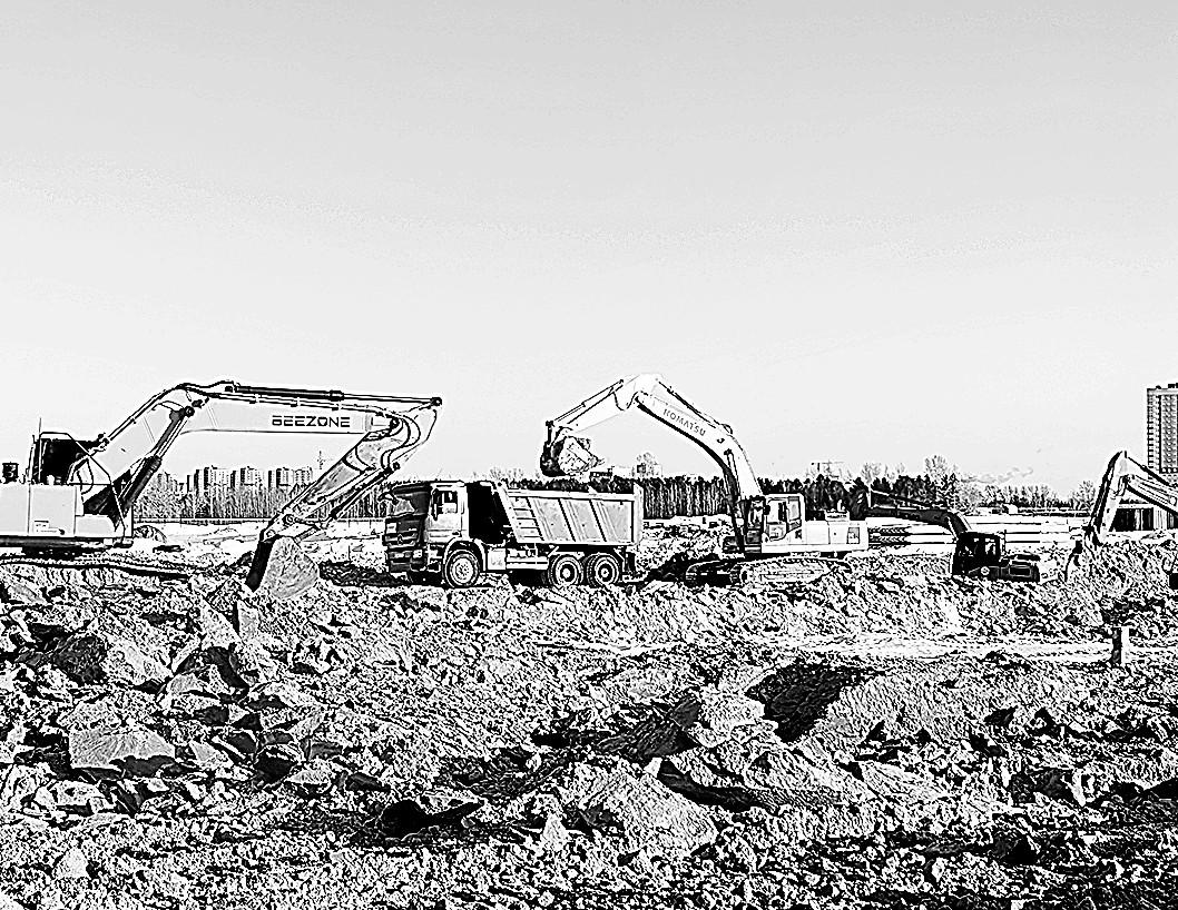 С моста по улице Мельникайте видно скопление техники на территории будущего кампуса. Бульдозеры перемещают грунт, самосвалы курсируют по временным дорогам….