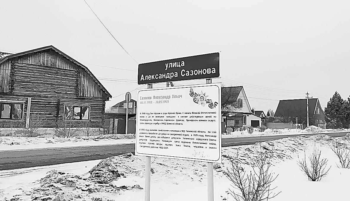 Из книги «Имя судьбы — Россия», изданной в 2007 году типографией областного ГУВД, я узнаю, что Александр Ильич Сазонов родился 8 ноября 1918 года в селе Сибеки Почепского района Брянской области. В 1936 году, окончив педагогический колледж, начал работать учителем, а через четыре года, перед войной, призван в армию. Прошел всю войну — воевал на Ленинградском, Волховском, Карельском фронтах, служил в Приморском военном округе, затем в милиции — в УМВД Брянской области. В 1955 году назначен заместителем начальника УВД Тюменской области, на этой должности проработал до ухода на пенсию в 1979 году.