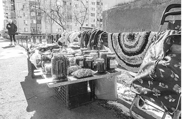 Возле поликлиники N 1 на улице Газовиков вижу старушку. На самодельном фанерном прилавке расставлены банки с грибами, капустой, разложены вязаные…