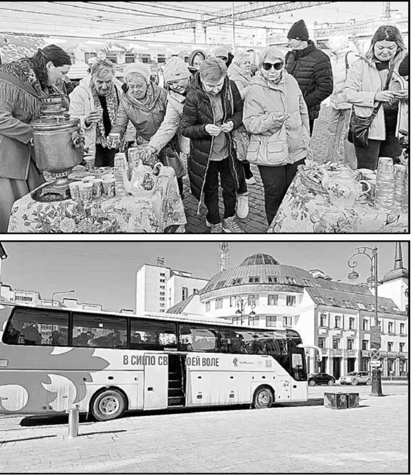 фото: Тюменские «купчихи» угощают туристов чаем; туристы на обзорной экскурсии по Тюмени.