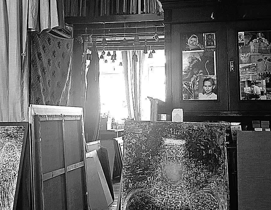 Мы сидим в его мастерской, которая расположилась в двух небольших комнатах на последнем этаже шестиэтажки. Обе комнаты окружены антресолями с картинами. Потолки высоченные. Создается ощущение, что до искусства в буквальном смысле сложно дотянуться.