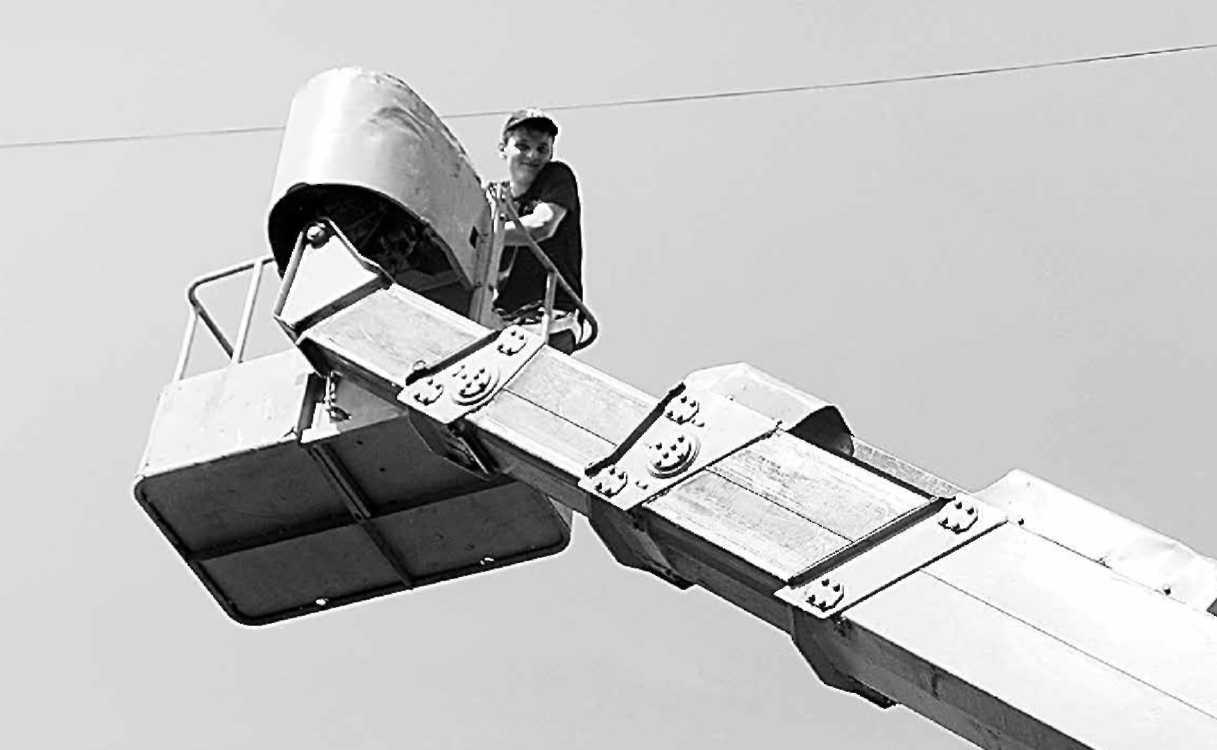 Над кронами деревьев улицы Ватутина застыла оранжевая стрела автовышки. В люльке вижу молодого парня, а он… ритмично покачивается в такт…