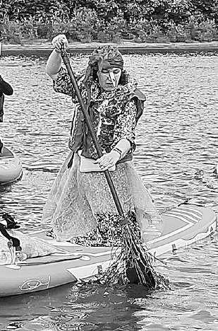 Многие украшали не только себя, но и свои доски (для этого была даже отдельная номинация). Одна из участниц застелила сап коврами, другая соорудила улей, закрепив на сапе множество воздушных шаров в виде пчел, много было всевозможных цветов и даже огромный цветочек Аленький, а сама участница, очевидно, нарядилась Настенькой из одноименной сказки. Мне понравилось, что некоторые творчески подошли даже к веслам, сделав из них часть образа. Например, «Баба яга» сделала из весла помело, с помощью которого и передвигалась, а команда мушкетеров соорудили из весел «лошадок на палках». Эта семья оказалась из Eкатеринбурга, две девушки-близняшки и их мама, Вероника Казакова. Я спросила, где же они потеряли четвертого мушкетера. Оказалось, что он тоже был, сам Д’Артаньян, у которого была самая красивая шляпа с большим пером, но в самый последний момент, увы, не смог поехать. Костюмы они полностью подготовили сами, и шляпы, и плащи, и даже сапоги. Кстати, сказать, мушкетеры участвовали в номинации «командный заплыв» и заняли в ней третье место.