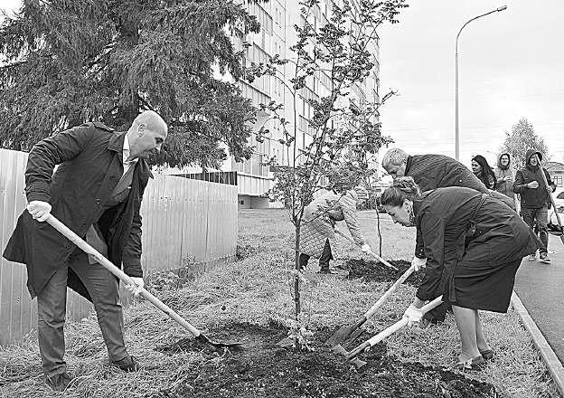 Рябину, яблоню и черемуху, росшие во дворе, пришлось спилить. Осталась одна береза, но это ненадолго. Сотрудники «Леспаркхоза» уже высадили аллею пирамидальных тополей вдоль улицы Карла Маркса, а руководитель управы Калининского округа Олег Савчук, депутат городской думы Eкатерина Вешкурцева, председатель палаты органов ТОС города Тюмени Альбина Селезнева высадили рябины.