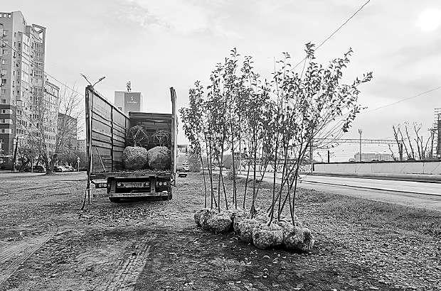 Прохладная погода положительно влияет на приживаемость растений, помогая им вытерпеть пересадку на новое место. В четверг у стелы «Город трудовой…