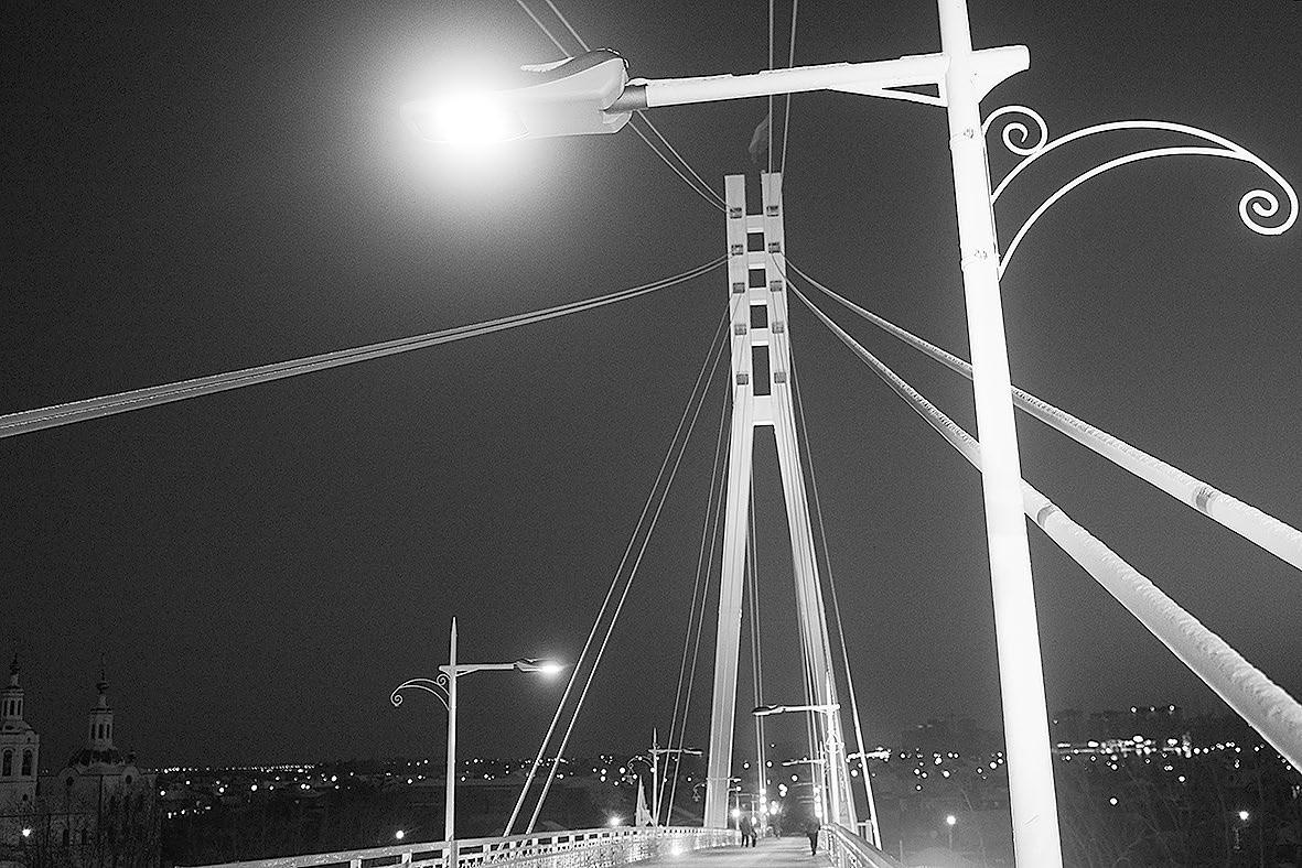 Особая история была с оформлением вантового моста. Объявили городской конкурс на лучшее оформление. Поступило около десятка предложений, выбрали три лучших. Был, например, вариант с подсветкой в форме сердечек. От него в результате отказались, но родилась идея назвать вантовый мост мостом Влюбленных, и горожане эту идею поддержали. В итоге решили воплотить образ бригантины: установить штурвал, а переходную зону оформить как палубу корабля. Нашли подрядную организацию, которая обещала выполнить имитацию палубной доски, но когда начали заливать асфальт, пустили каток, выяснилось, что желаемого эффекта добиться не получается. Поэтому покрытие пешеходной зоны сделали обычным. Чуть позже для моста Влюбленных разработали и специальную программу архитектурной подсветки.