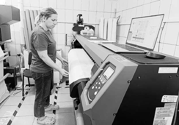 На первом этаже, в цехе широкоформатной печати, разговор меняет масштаб. «Вот этот принтер может запечатать практически любую твердую плоскость, — говорит Валерия, — не только баннер. Мебельный фасад, сэндвич-панель, акрил. Мы делали оформление для детских садов — целые стены с рисунками».