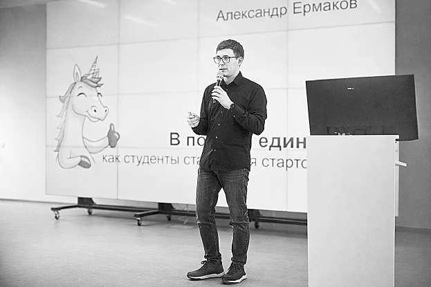 Eсли Анастасия описывала систему, то Александр Eрмаков в лекции «В поисках единорога: как студенты становятся стартаперами» говорил уже о внутренней логике стартапа. Он начал с шутки про единорогов — так в технологическом предпринимательстве называют компании, достигшие миллиардной оценки. Но до миллиардов еще надо дорасти, поэтому рассуждать пока стоит в плоскости не «от врача к миллиардеру», а хотя бы от студента к человеку, который умеет найти проблему и предложить решение. Причем, как отдельно подчеркивал спикер, работать в этой сфере нужно не только с будущими врачами, а со студентами вообще. Университетская среда, если в ней есть пространство для эксперимента, способна выращивать такие истории.